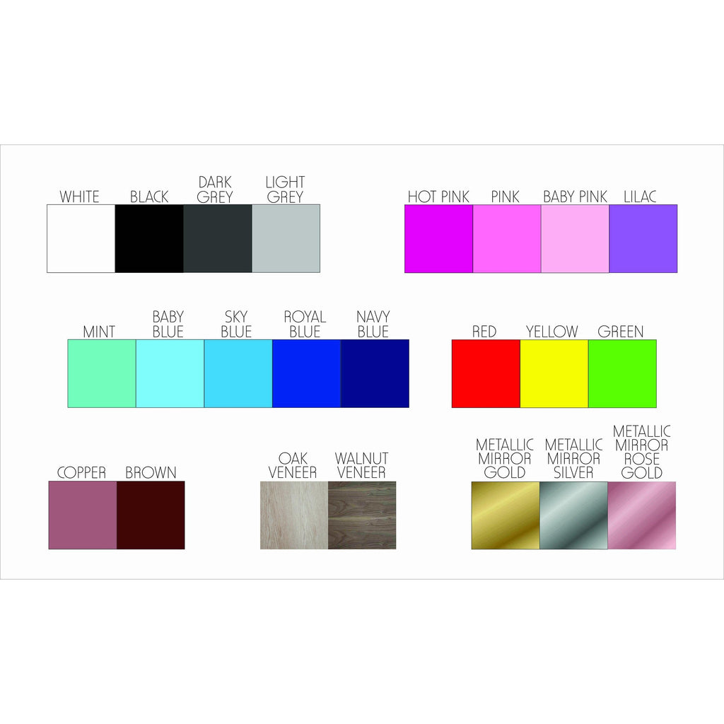 Available colours: Baby Blue, Baby Pink, Black, Brown, Copper, Dark Grey, Gold, Green, Grey, Hot Pink, Light Green, Lilac, Mint, Navy Blue, Oak, Pink, Red, Rose Gold, Royal Blue, Silver, Sky Blue, Walnut, White, Yellow